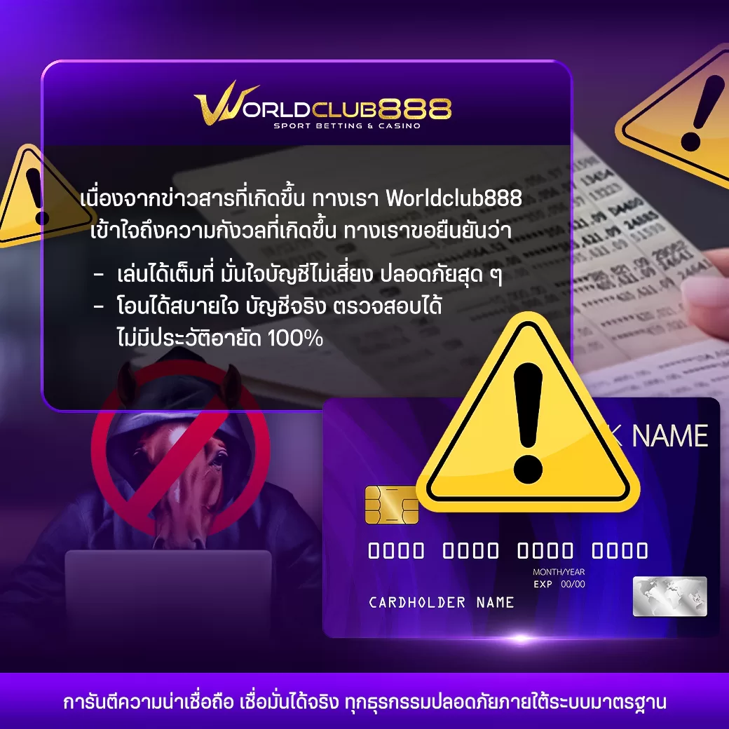 WORLDCLUB888 ใช้ระบบ SSL แบบเดียวกับธนาคารในการเข้ารหัสข้อมูลผู้ใช้งาน ป้องกันข้อมูลรั่วไหล และมีใบอนุญาตจากองค์กรเกมออนไลน์ต่างประเทศ เพื่อรับรองความโปร่งใสและความยุติธรรม